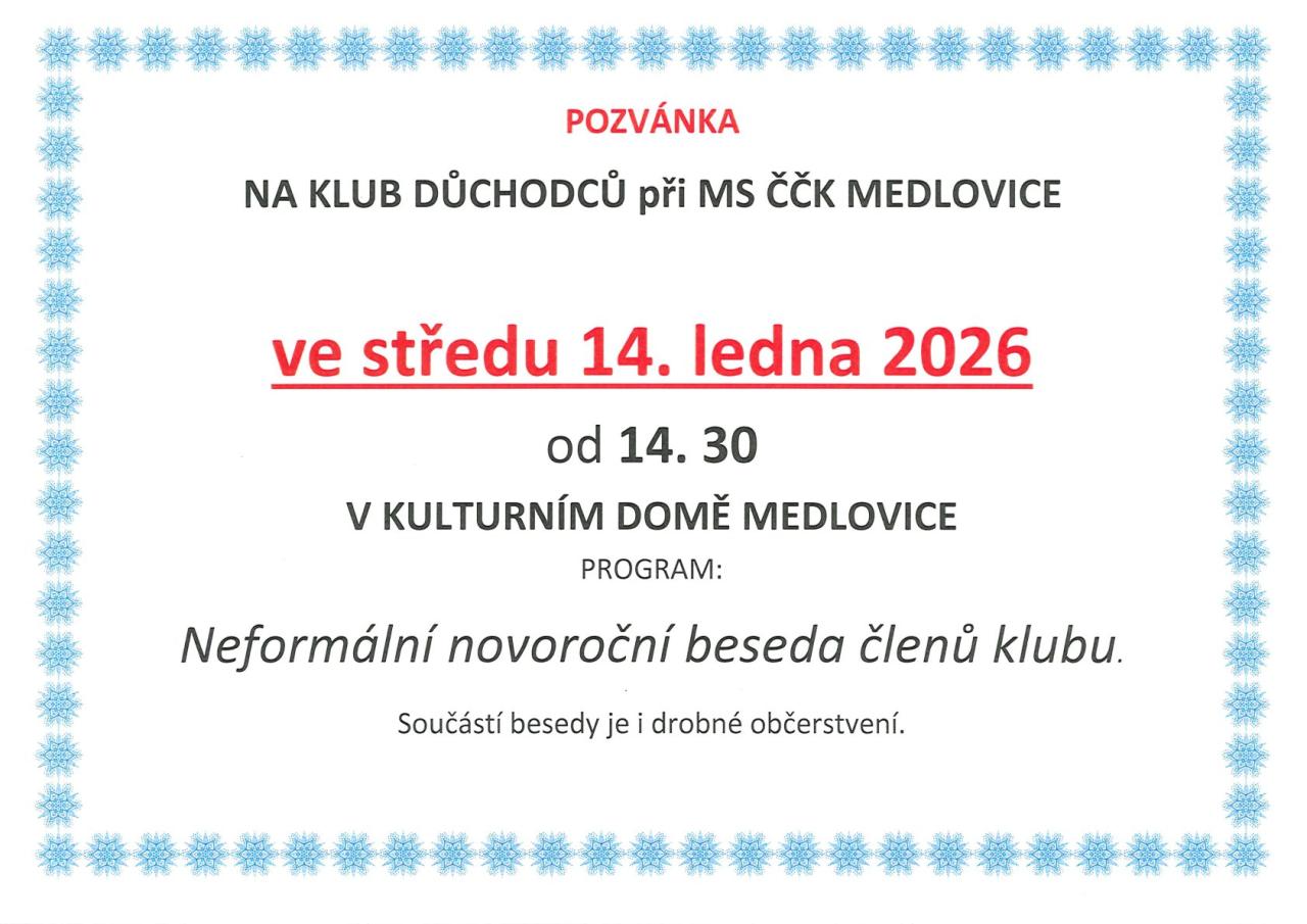 Neformální novoroční beseda proběhne ve středu 14. 1. 2026 od 14:30 na KD Medlovice.