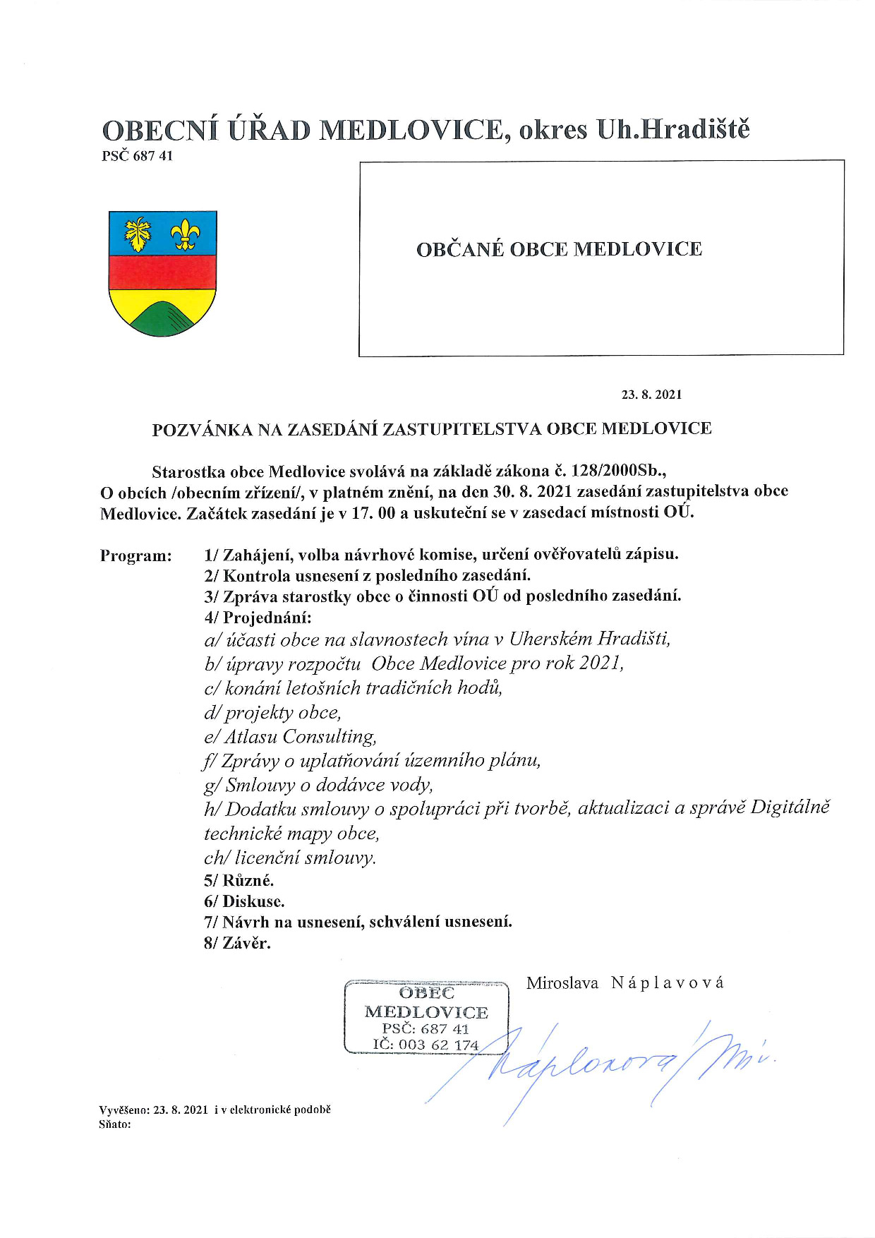 POZVÁNKA NA ZASEDÁNÍ ZASTUPITELSTVA OBCE MEDLOVICE 8/2021